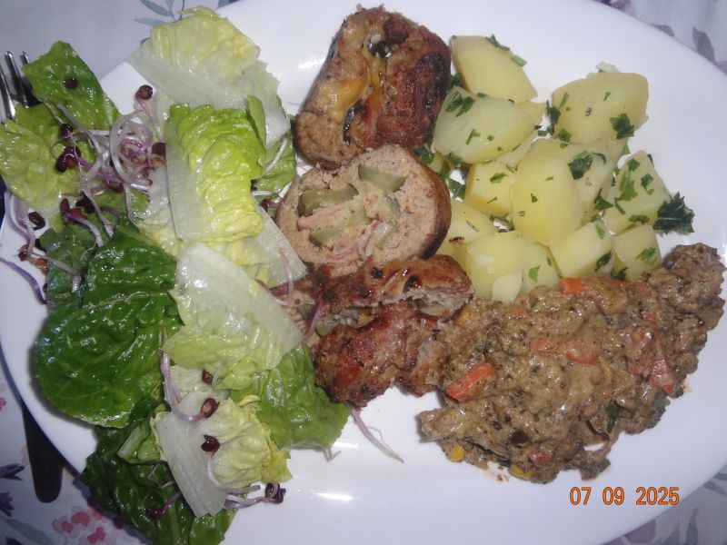 Gefüllter Hackbraten, Farmers-Gemüse in Schmand-Pilz-Soße, Pet.-Kart., Mini-Romana-Salat mit Radieschen-Sprossen |