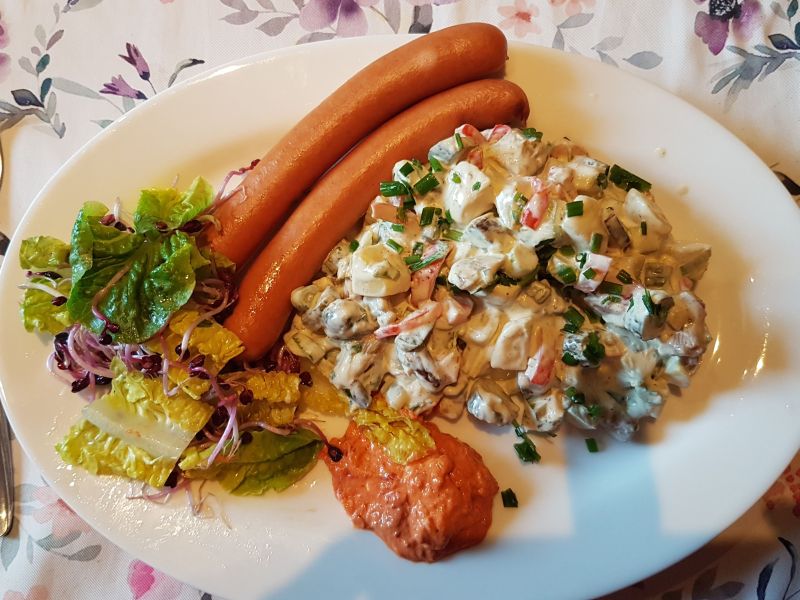 | Schleizer Würstchen, Kart.-Salat mit Mayonnaise, Möhren, Cornichons, Zucchini, Waldpilzen, Paprika und Lauchzwiebeln, Dip, Mini-Romana-Salat mit Radieschen-Sprossen |
