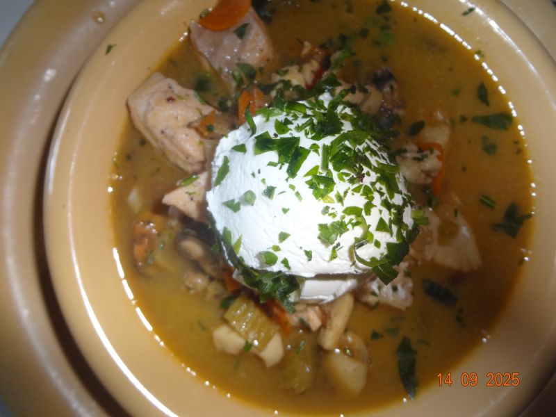 Fleisch-Gemüse-Eintopf, Schmand, Petersilie |