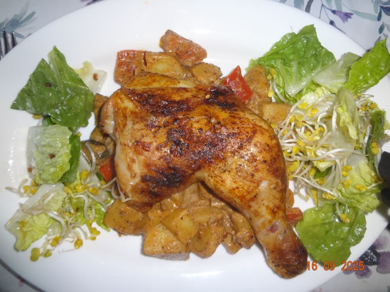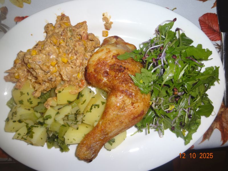 Hähnchen-Schenkel aus der Heißluft-Fritteuse, Farmers-Gemüse mit Sekt-Schmand-Creme, Pet.-Kart. mit Sellerie, Rukola-Salat mit Sprossen |