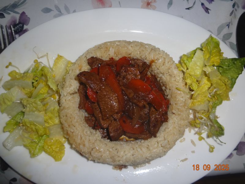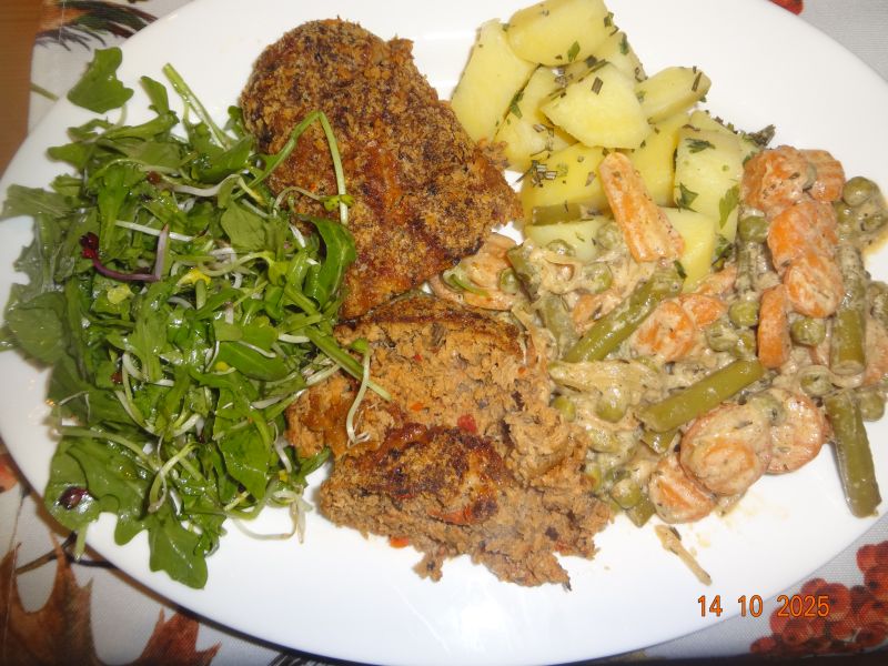 | Rindfleisch-Hackbraten, Asia-Gemüse, Pet.-Kart., Lollo-Rosso-Salat mit Rote-Bete-Sprossen |
