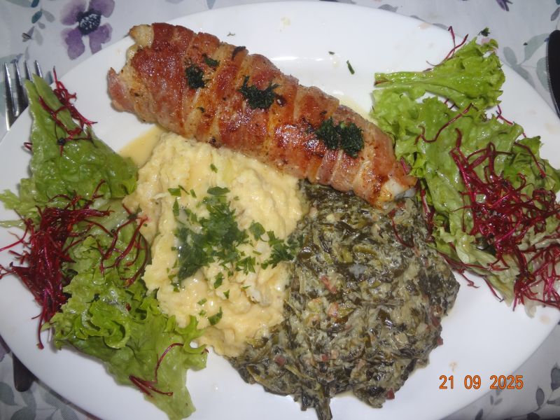 Schollenfilet im Speckmantel, Spinat mit Speck und Zwiebeln, Kart.-Sellerie-Püree mit Käse und Schmand, Lollo-Bionda-Salat mit Rote-Bete-Sprossen |