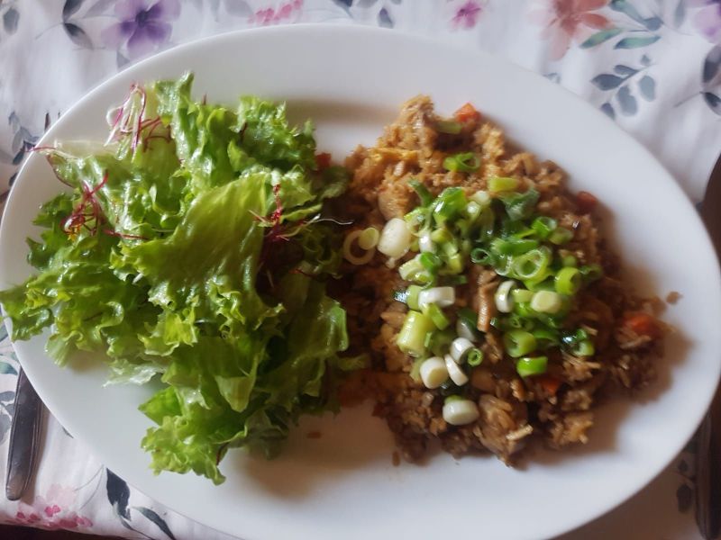 | Nasi Goreng mit mit Hähnchen aus dem Woke, Lollo-Bionda-Salat mit Rote-Bete-Sprossen |