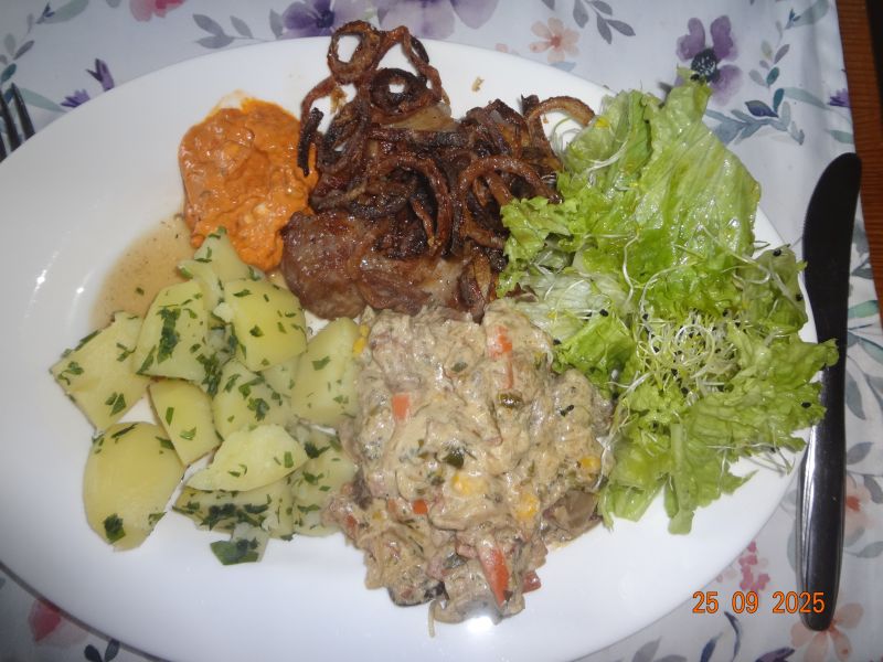 Nackensteak, Ajvar-Tomatenmark-Schmand-Dip, Pilz-Gemüse in Sekt-Schmand-Soße, Pet.-Kart., Lollo-Bionda-Salat mit Alfalfa-Sprossen |