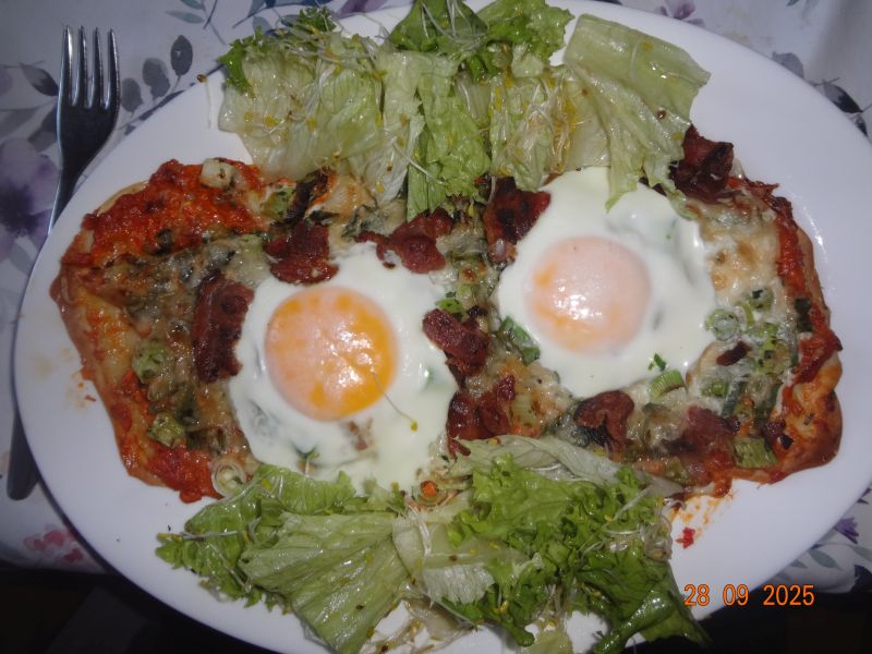 Flammkuchen mit ATS-Dip, Lauchzwiebeln, Bacon und Ei, Lollo-Bionda-Salat mit Alfalfa-Sprossen |