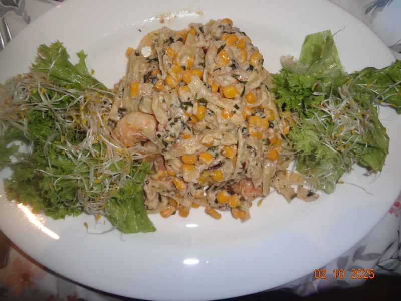 | Tagliatelle mit Garnelen, Gemüsemais und Kräutern in cremiger Alfredo-Soße, Lollo-Bionda-Salat mit Alfalfa-Sprossen |