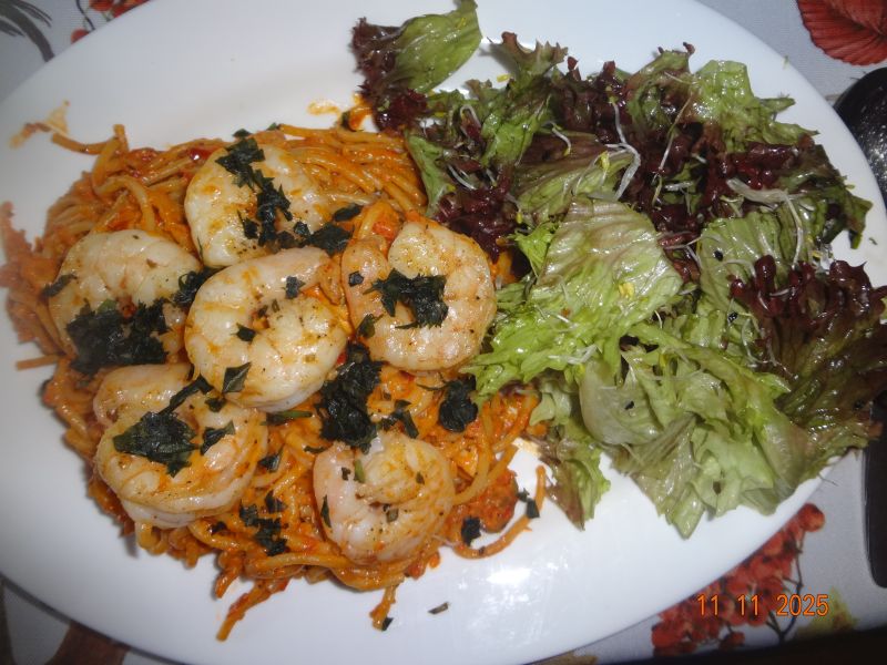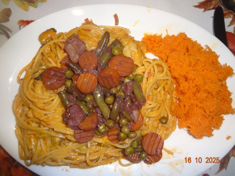 Spaghetti mit Garnelen und Meeresfrüchten in Tomaten-Ajvar-Schmand-Soße, gemischtes Gemüse, Möhrensalat |