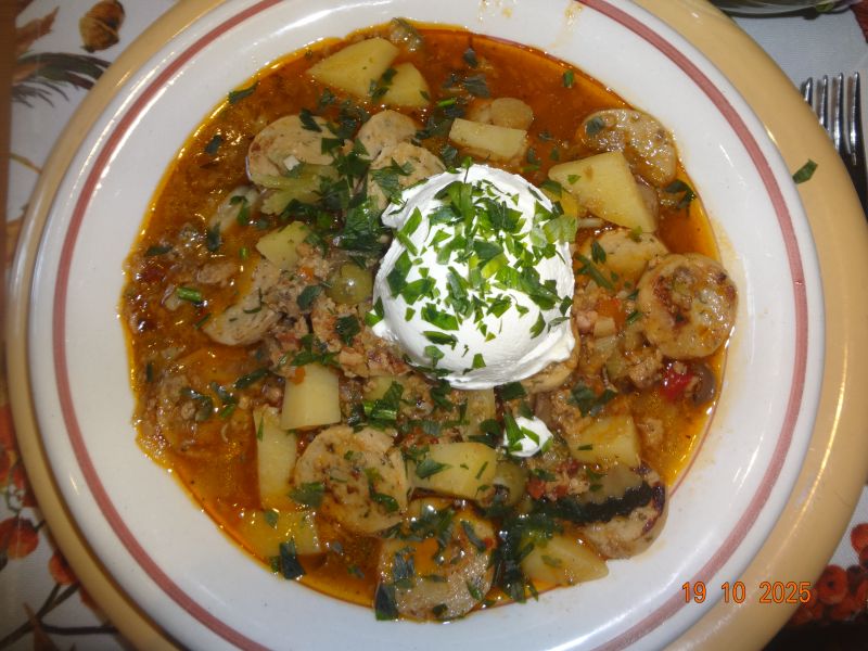 | Eintopf in Rinderbrühe mit Bratwurst-Würfeln, Garnelen, Waldpilzen, gemischtem Gemüse, Bacon, und Zwiebeln(*), Eisbergsalat mit Kräutern der Provènce |