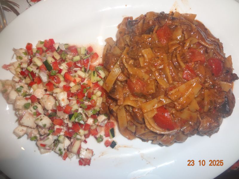 | Tagliatelle mit Fisch, Meeresfrüchten und gemischtem Gemüse, Weißkohl-Salat mit Paprika-Streifen |