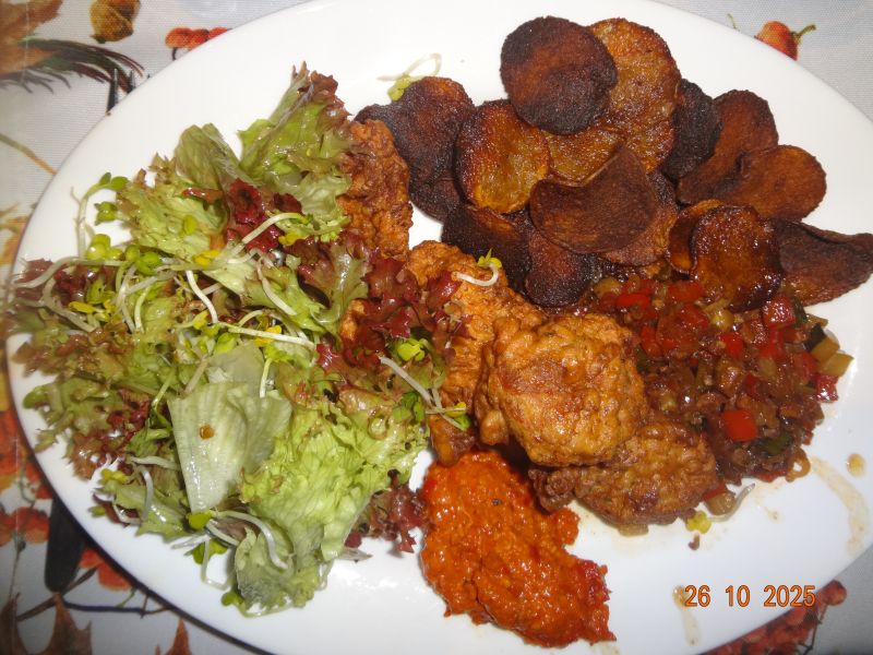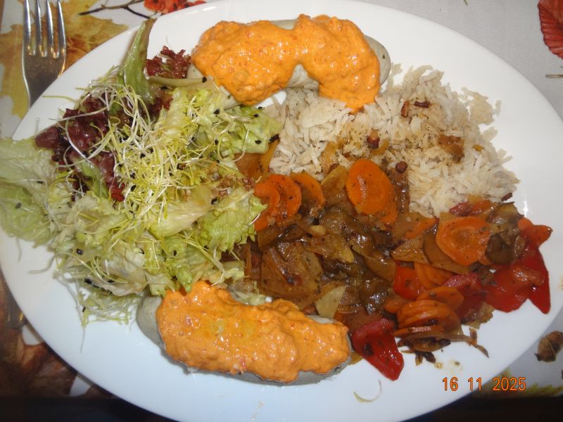| Schollenfilet, französische Gemüsepfanne, in Hühnerbrühe gegarter Reis, Salat mit Rotkohl-Sprossen |