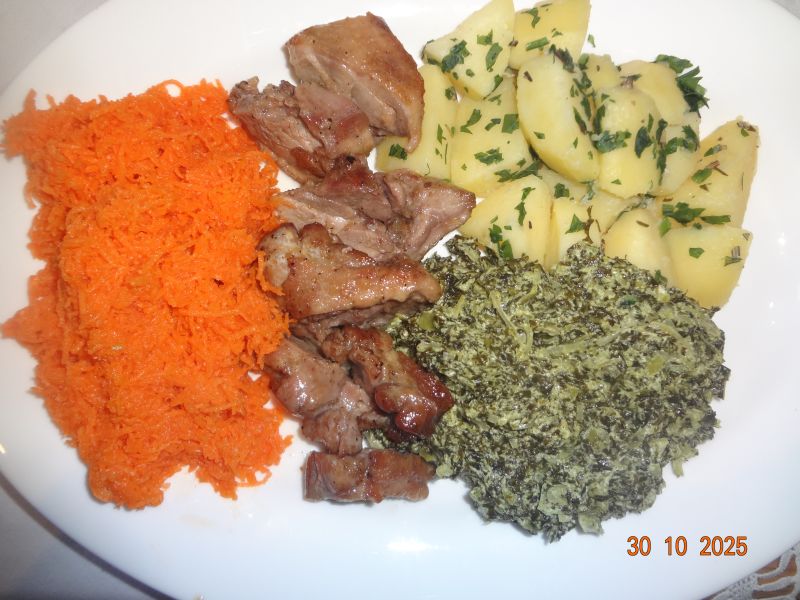 Kasseler-Würfel in Spinat, überbackene Kartoffel-Scheiben, Möhrensalat |