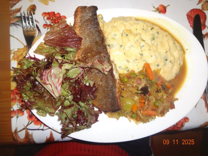 | Kräuter-Dorade mit Kart. und Möhren, Gemüse-Salat mit Mozzarella |