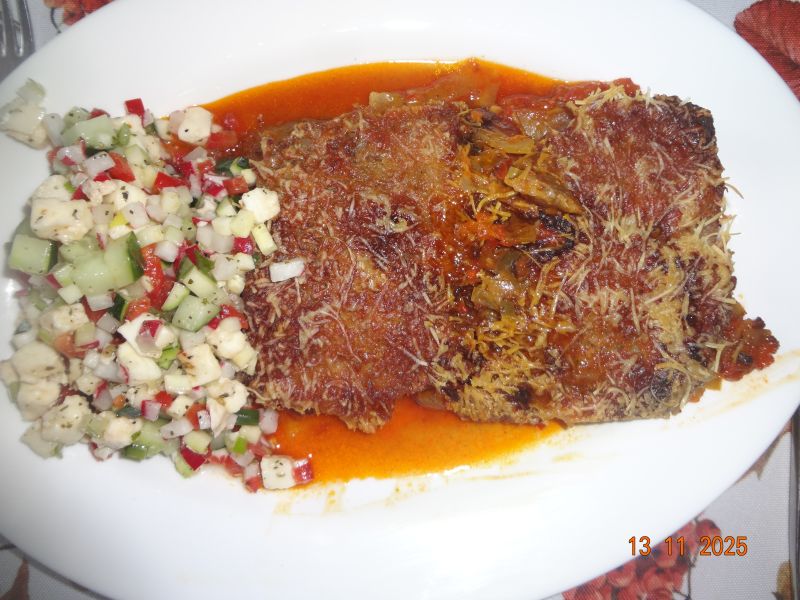 | Paniertes Schweine-Filet mit Tomaten-Ajvar-Dip, Blumenkohl mit Panko-Bröseln, Basmatireis in Rinderbrühe gegart, Möhrensalat |