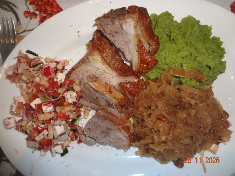 Gegrilltes Eisbein, Erbsenpüree, Rum-Rosinen-Sauerkraut und Gemüsesalat mit Feta |