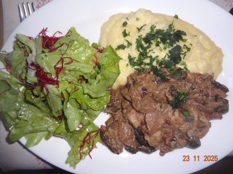 | Gulasch mit Champignons in Pilz-Rahm-Soße, Pet.-Kart., Eichblattsalat mit China-Rose-Sprossen |