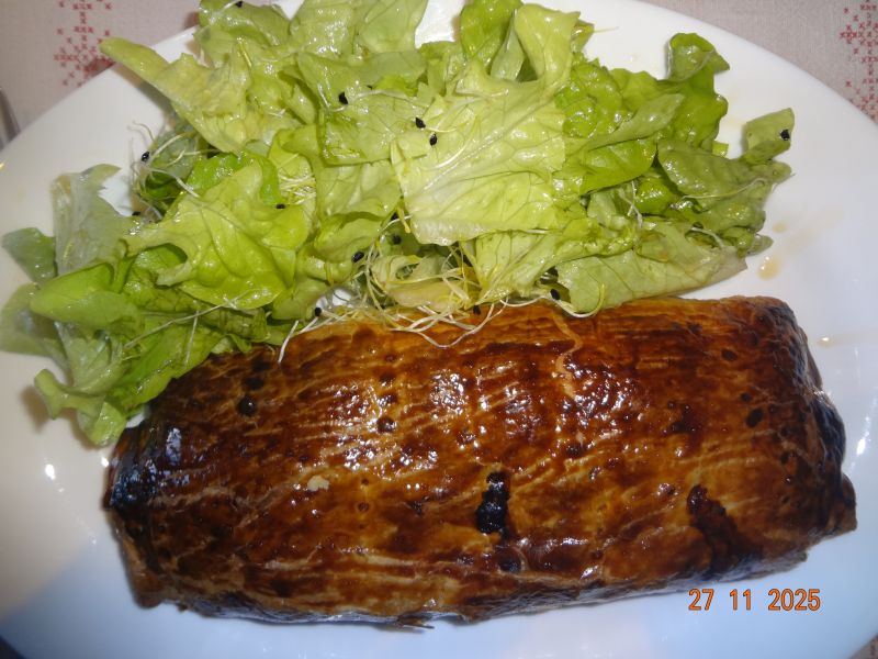 Rouladen vom Schweine-Nacken, gemischtes Gemüse(Brokkoli, Blumenkohl, Möhren), Sekt-Schmand-Soße, Rosmarin-Kart., Lollo-Bionda-Salat mit Rote-Bete-Sprossen |