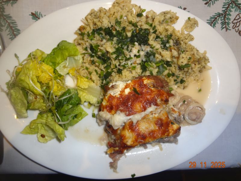 | Schichtfleisch, selbstgemachte Kräuter-Spätzle und Salatherzen mit Alfalfa-Sprossen |